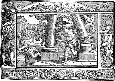 Description: Samson pushes down the pillars of the Temple of Dagon and dies along with 3,000 Philistines. The initials of the artist or engraver Paul Creutzberger (PC) have been placed on the base of a pillar at the bottom. The image is flanked by Goliath on the left and the young David on the right.