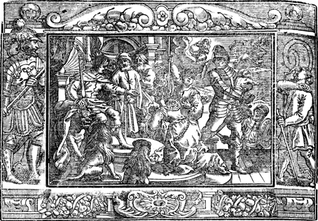 Description: Solomon appears on his throne as two women approach, both claiming custody of a baby. Solomon's servant prepares to draw his sword to divide the child between the two women. The image is flanked by Goliath (left) and the young David.