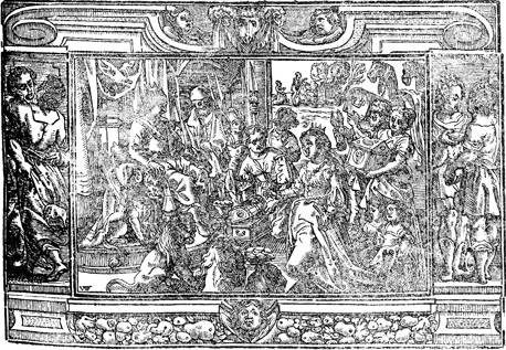 Description: The Queen of Sheba visits King Solomon in Jerusalem. The initials of the artist or engraver (VW) have been placed in the bottom-left. The image is flanked by Jacob wrestling with the angel of God (left) and Jacob buying Esau’s birthright for a bowl of stew.
