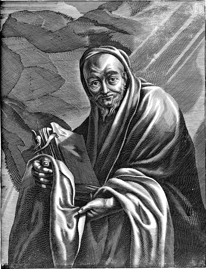 Description: Elisha is depicted wearing a hooded robe and holding a large book, while his gaze is directed towards the viewer.