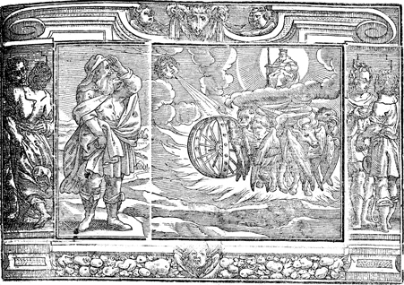Description: Ezekiel’s vision of the heavenly throne room includes God reigning above, the wheel within the wheel, and the four creatures (man, lion, ox, and eagle). The image is flanked by Jacob wrestling with the angel of God (left) and Jacob buying Esau’s birthright for a bowl of stew.