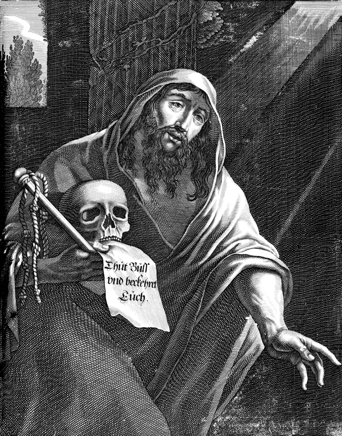 Description: Jonah is depicted holding a skull, a staff with rope tied around one end, and a parchment containing writing.