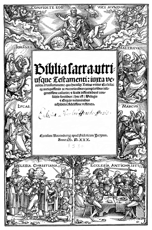 Description: This title-page border by Sebald Beham (1500-1550) depicts the resurrected Christ, having triumphed over Satan and Death (top), the gospel writers with their respective attributes (sides) and a rendering of the church of the Christians as those loving others and following the teachings of Peter and Paul seen with attributes preaching from pulpit (bottom left) alongside a rendering of the church of the antichrist depicted as a violent seen between rulers (bottom right).