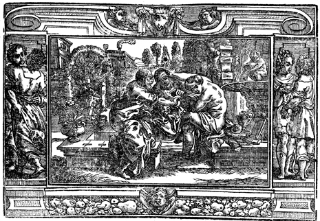 Description: While bathing alone in her garden, Susanna is approached by two elders of the people who try to convince her to lay with them, but Susanna refuses. The panel to the left depicts Jacob wrestling with the angel of God, while that on the right shows Jacob buying Esau’s birthright for a bowl of stew.