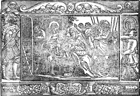 Description: The magi bring gifts to the infant Jesus. The image is flanked by Goliath (left) and the young David.