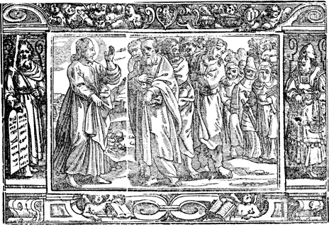 Description: Jesus delivers the Sermon on the Mount to his disciples, as the Jewish leaders appear in the background. The image is flanked by Moses with the Ten Commandments (left) and Aaron as priest.