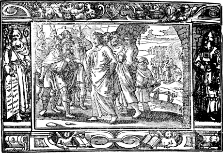 Description: A centurion meets Jesus in Capernaum and asks him to heal his servant. In the background Jesus heals a leper on the way to the city. The initials of the artist or engraver Paul Creutzberger (PC) have been placed in the bottom-right corner. The image is flanked by Moses with the Ten Commandments (left) and Aaron as priest.