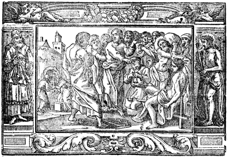 Description: While in jail, John the Baptist sends a message to Jesus through his disciples. The initials of the artist or engraver Paul Creutzberger (PC) have been placed at the bottom toward the middle. The image is flanked by Aaron as priest (left) and Jesus as the Man of Sorrows.