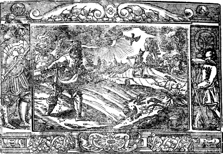 Description: A sower casts seed on all different types of soil and the devil sows in weeds alongside the good. The image is flanked by Goliath (left) and the young David.