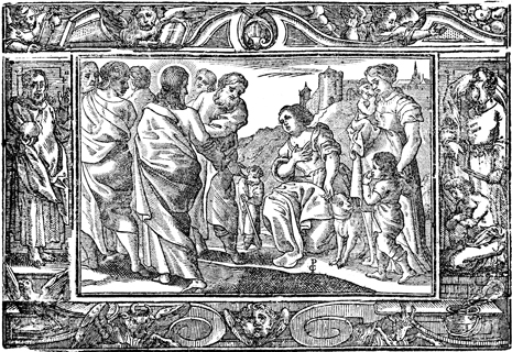 Description: Jesus heals the Canaanite woman's demon-possessed daughter. The monogram of the engraver or artist (PC) has been placed in the lower center portion of the woodcut. The initials of the artist or engraver Paul Creutzberger (PC) have been placed at the bottom toward the middle. This image is flanked by Jesus holding an orb (left) and Abraham about to offer Isaac as a sacrifice. The symbols for the four Gospels are placed above (Matthew and Mark) and below (John and Luke) the left panel, while the angel (who prevented Abraham from slaying Isaac) and the ram and censer are shown above and below the right panel.