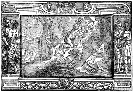 Description: In the foreground, while the disciples sleep, Jesus prays in the Garden of Gethsemane and is comforted by an angel. In the background, Judas comes with an armed multitude to arrest Jesus. The initials of the artist or engraver Paul Creutzberger (PC) have been placed at the bottom toward the middle. The panel to the left depicts Jacob wrestling with the angel of God, while that on the right shows Jacob buying Esau’s birthright for a bowl of stew.