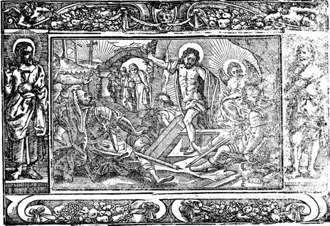 Description: In the foreground, Jesus rises from the dead, and an angel sits where he was laid. In the background, Mary Magdalene, James' mother Mary, and Salome come to the tomb to anoint the body but find only the angel in the tomb. The initials of the artist or engraver Paul Creutzberger (PC) have been placed in the bottom-right corner. The image is flanked by Jesus holding an orb (left) and John the Baptist in animal skins.