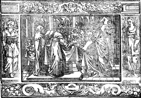 Description: Mary and Joseph brought the infant Jesus to present him at the temple. The image is flanked by Truth (left) and Justice.