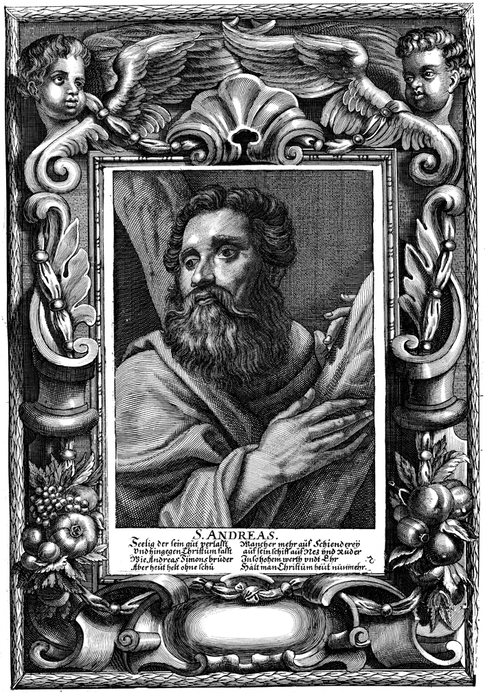 Description: The Apostle Andrew leaning on a saltire, or x-shaped cross, which was the instrument of his martyrdom.