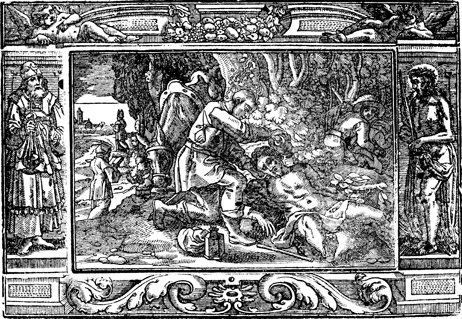 Description: A Samaritan stops to help a man wounded by thieves, while a priest and a Levite pass by. The image is flanked by Aaron (left) and the Man of Sorrows.