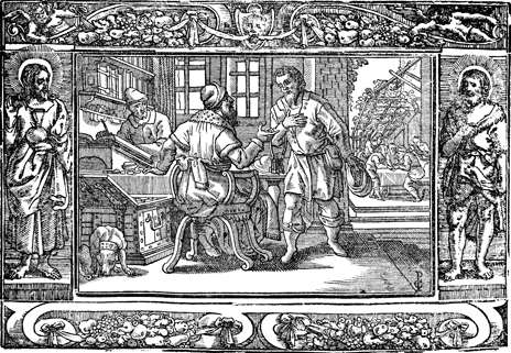 Description: The rich man fires the dishonest steward and demands a report on his accounts. In the rear, the dishonest steward adjusts his accounts. The initials of the artist or engraver Paul Creutzberger (PC) have been placed in the bottom-right. The image is flanked by Jesus holding an orb (left) and John the Baptist in animal skins.