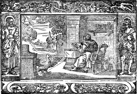 Description: The Apostle John writes his gospel with an eagle, his attribute, nearby. The image is flanked by Jesus Christ with an orb (left) and John the Baptist in animal skins.