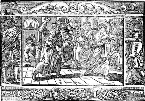 Description: Jesus tells the Jews that they are children of the devil rather than children of God or Abraham. In response, they pick up stones to throw at Him. The initials of the artist or engraver Paul Creutzberger (PC) have been placed in the bottom-center. The image is flanked by Goliath (left) and a young David.