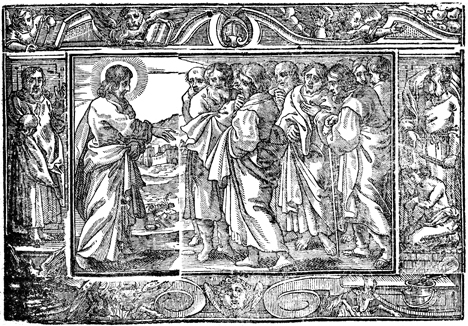 Description: Jesus bids his disciples farewell and instructs them regarding the Helper, the Spirit of Truth, who is to come. This image is flanked by Jesus holding an orb (left) and Abraham about to offer Isaac as a sacrifice. The symbols for the four Gospels are placed above (Matthew and Mark) and below (John and Luke) the left panel, while the angel (who prevented Abraham from slaying Isaac) and the ram and censer are shown above and below the right panel.
