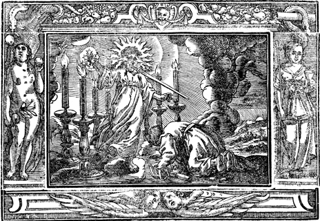 Description: John's vision of the one like a son of man among the seven golden lampstands. John is pictured at his feet. The image is flanked by Eve (left) and an allegorical figure representing the Church.