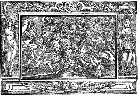 Description: After the first four seals are opened, four horsemen roam the earth bringing great calamity. They are shown carrying a bow, a sword, scales, and a scythe. The initials of the artist or engraver (VW) have been placed in the bottom-right. The image is flanked by Eve (left) and an allegorical figure representing the Church.