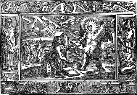 Description: An angel instructs John to eat the little scroll. The many kings that John must prophesy concerning are represented on the left of the image. This image is flanked by Jesus holding an orb (left) and Abraham about to offer Isaac as a sacrifice. The symbols for the four Gospels are placed above (Matthew and Mark) and below (John and Luke) the left panel, while the angel (who prevented Abraham from slaying Isaac) and the ram and censer are shown above and below the right panel.