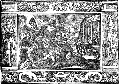 Description: In the background right, John measures the temple and the altar as instructed, while in the foreground two powerful witnesses prophesy. The beast from the bottomless pit waits for them to finish their testimony, so that he may kill them. In the background left, the two witnesses are taken to heaven. The image is flanked by Truth (left) and Justice.