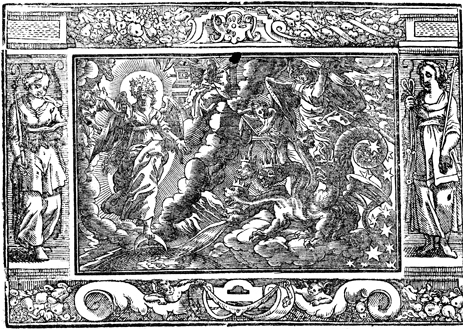 Description: The woman’s baby is saved from the beast upon his birth, and the dragon is defeated by angels. The image is flanked by Truth (left) and Justice.
