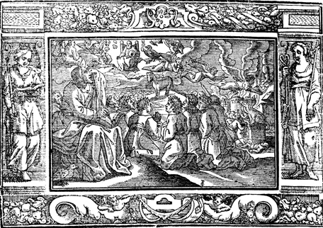 Description: The three angels are unleashed upon the earth, as the 144,000 worship the lamb. The initials of the artist or engraver Paul Creutzberger (PC) have been placed in the bottom-center. The image is flanked by Truth (left) and Justice.
