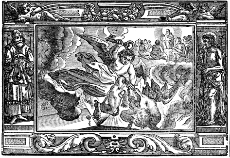 Description: An angel, holding a key, binds the beast in the abyss for the thousand years of peace. The monogram of the engraver or artist Paul Creutzberger (PC) has been placed in the bottom center portion of the woodcut. The image is flanked by Aaron as priest (left) and the Man of Sorrows.