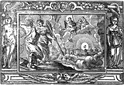 Description: An angel shows John the new heavenly Jerusalem, with the Lamb providing its light. The monogram of the engraver or artist Paul Creutzberger (PC) has been placed in the bottom center portion of the woodcut. The image is flanked by Eve (left) and an allegorical figure representing the Church.
