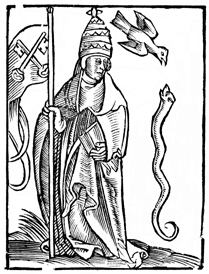 Description: The Pope listens to the snake, representing the devil, and the bird, representing the Holy Spirit argue.