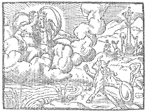 Description: The king and queen god cuddle as a man is turned into a bull and others worship an idol on top a pillar.