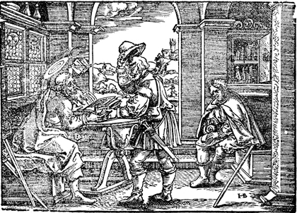 Description: Paul, with attribute nearby, writes an epistle and sends another with his carrier. The monogram of the artist, Hans Brosamer (ca. 1500-ca. 1554), is on the lower right side of the wood cut.