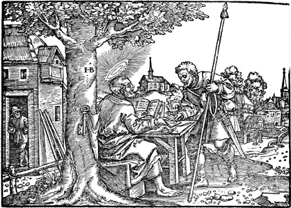 Description: The Apostle Peter sends a letter with his carrier. His attribute, the key, is nearby. The monogram of the artist, Hans Brosamer (ca. 1500-ca. 1554), is on the tree.