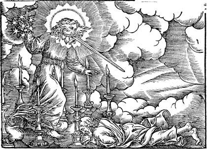 Description: John's vision of the one like a son of man among the seven golden lampstands. John bows at his feet.