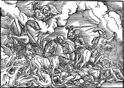 Description: After the first four seals are opened, four horsemen roam the earth bringing great calamity. They are shown carrying a bow, a sword, scales, and a scythe.