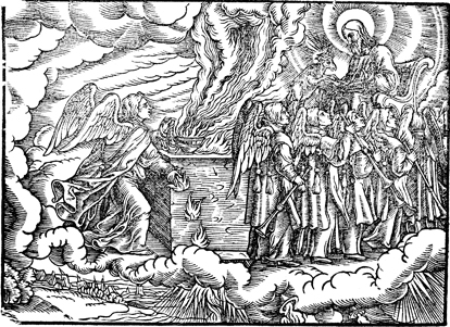 Description: Upon the opening of the seventh seal, angels are given seven trumpets, while another pours out a golden censor upon the earth.