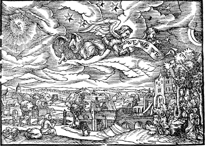 Description: At the sounding of the fourth trumpet the sun, moon, and stars are struck and an angel cries out "Woe, Woe, Woe".