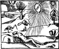 Description: God, represented by a radiating light encircled around the Tetragrammaton, forms Adam from the dust of the earth.