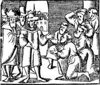 Description: Joseph conceals his identity from his brothers, as they kneel before him and request grain during an intense famine.