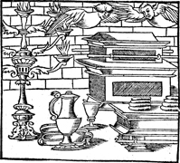 Description: The Ark of the Covenant, the lampstand, the table with the bread of presence, and other ritual objects.
