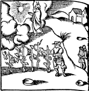 Description: God gives Moses regulations concerning harvest, as the harvest is gathered in the foreground.