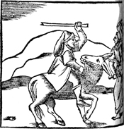 Description: Balaam beats his donkey for stopping as an angel stands in its way.