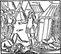Description: Joshua and his soldiers stand over a group of dead kings, symbolizing their victory over the Canaanites.