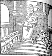 Description: Solomon sits enthroned at the top of a staircase lined with lion statues.
