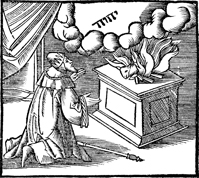 Description: Solomon kneels before the menorah in prayer to ask God for wisdom. The artist has indicated God’s presence by placing the Tetragrammaton in an illuminated cloud.