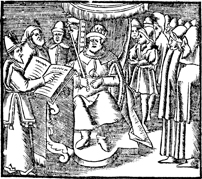 Description: As Josiah sits on his throne with his attendants gathered around, a priest reads from a book of the law to them.