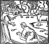 Description: Daniel bows on the ground in prayer before an angel, while in the background is a walled city (Susa) with a figure standing over the gate and pointing toward three rams and a goat descending from the clouds.