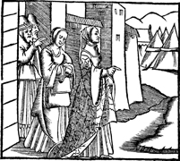 Description: Judith and her maidservant leave the city gate of Bethulia with the blessing of Uzziah and the city elders. The tents of the Assyrian army are visible in the distance.